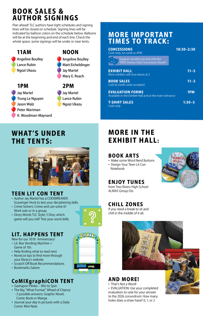 Attendees wishing to report anything should seek out a non-teen ambassador in a Teen Lit Con t-shirt if that person can’t help, she or he will help you find the right person. Teen Lit Con does not tolerate any solicitation to our attendees without prior approval; those reported to be doing so will be asked to leave the event. For the complete code of conduct.